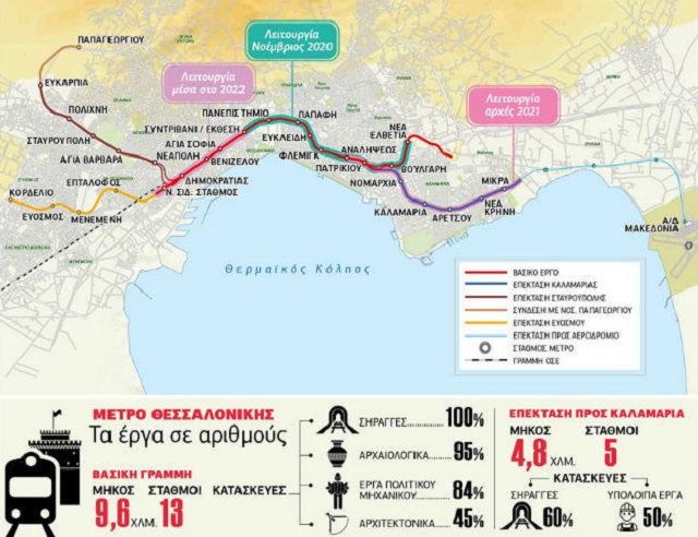 Στα τέλη του 2020, με βάση τον προγραμματισμό της δημόσιας εταιρείας «Αττικό Μετρό» που έχει την ευθύνη του έργου, θα δοθεί στην κυκλοφορία το πρώτο τμήμα της βασικής γραμμής από τον σταθμό ΔΕΘ-Σιντριβάνι ώς τη Νέα Ελβετία και στις αρχές της επόμενης χρονιάς θα ακολουθήσει ολόκληρη η επέκταση ώς τη Μίκρα. Μέσα στο 2022 θα ακολουθήσει το υπόλοιπο κομμάτι ώς τον Νέο Σιδηροδρομικό Σταθμό, που επηρεάζεται από την ανάδειξη των αρχαιοτήτων στους σταθμούς Βενιζέλου και Αγίας Σοφίας.