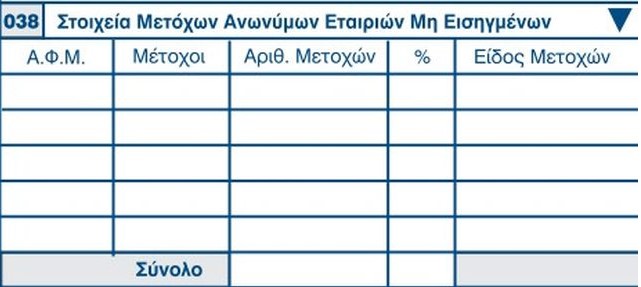 Ακόμη, στον κωδικό «038», θα αναγράφονται τα στοιχεία των μετόχων των Ανωνύμων Επιχειρήσεων που είναι μη εισηγμένες στο Χρηματιστήριο. Συγκεκριμένα θα αναγράφονται ο ΑΦΜ, το όνομα, ο αριθμός των μετοχών, το ποσοστό συμμετοχής και το είδος των μετοχών.