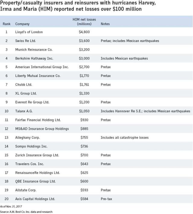 Τα Lloyd’s του Λονδίνου, η Swiss Re Ltd. και η Munich Reinsurance Co. δέχτηκαν τα ισχυρότερα χτυπήματα από τις καταστροφικές ζημιές το τρίτο τρίμηνο του 2017, σύμφωνα με ανακοίνωση της A.M. Best Co. Inc.