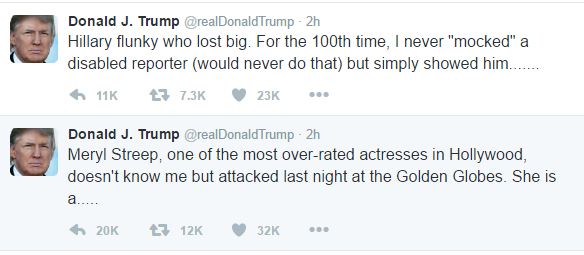 «Η Μέριλ Στριπ, μία από τις πιο υπερτιμημένες ηθοποιούς του Χόλυγουντ, ενώ δεν με ξέρει μου επιτέθηκε χθες βράδυ στις Χρυσές Σφαίρες. Είναι μία οπαδός της Χίλαρι που έχασε χοντρά. Για 100η φορά, ποτέ δεν "κορόϊδεψα" έναν ρεπόρτερ με ειδικές ανάγκες (δεν θα το έκανα ποτέ αυτό), απλώς τον εξέθεσα όταν παραποίησε εντελώς μία ιστορία που έγραψε πριν από 16 χρόνια απλά για να με κάνει να φανώ κακός. Άλλη μια περίπτωση των άτιμων ΜΜΕ», σημείωσε ο Τραμπ.