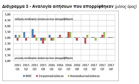 Αμετάβλητοι παρέμειναν και οι όροι χορήγησης δανείων προς νοικοκυριά, το δ΄ τρίμηνο του 2017. Η αναλογία των αιτήσεων για στεγαστικά δάνεια και για καταναλωτικά δάνεια που απορρίφθηκαν παρέμεινε αμετάβλητη σε σχέση με το προηγούμενο τρίμηνο (βλ. Διάγραμμα 3).