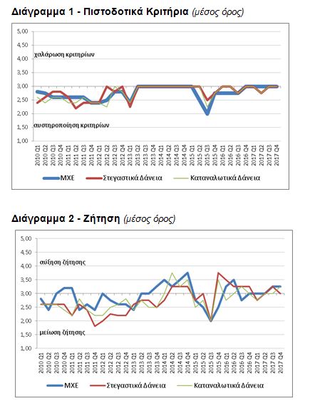 Το δ΄ τρίμηνο του 2017, τόσο τα κριτήρια χορήγησης δανείων όσο και οι όροι χορήγησης δανείων προς τις μη χρηματοπιστωτικές επιχειρήσεις (ΜΧΕ) παρέμειναν αμετάβλητα σε σχέση με το γ΄ τρίμηνο (βλ. Διάγραμμα 1), εξέλιξη σύμφωνη με τις προσδοκίες που είχαν διατυπωθεί στην έρευνα του προηγούμενου τριμήνου. Επιπλέον, οι τράπεζες αναμένουν ότι τα κριτήρια γενικά θα παραμείνουν σχεδόν αμετάβλητα κατά τη διάρκεια του α΄ τριμήνου του 2018, αν και αναμένεται ότι τα κριτήρια για τη χορήγηση μακροπρόθεσμων δανείων θα γίνουν ως ένα βαθμό πιο αυστηρά.