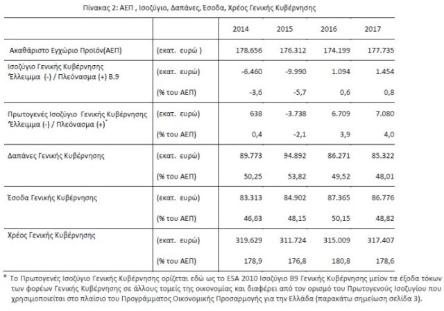 Συγκεκριμένα, το πρωτογενές πλεόνασμα γενικής κυβέρνησης ανήλθε πέρυσι σε 7,080 δισ. ευρώ έναντι 6,709 δισ. ευρώ το 2016, ενώ στο ίδιο διάστημα, το δημόσιο χρέος μειώθηκε ως ποσοστό του ΑΕΠ από 180,8% σε 178,6% αλλά αυξήθηκε σε απόλυτα μεγέθη από 315,009 δισ. ευρώ σε 317,407 δισ. ευρώ. Το ΑΕΠ διαμορφώθηκε πέρυσι σε 177,335 δισ. ευρώ έναντι 174,199 δισ. ευρώ το 2016.
