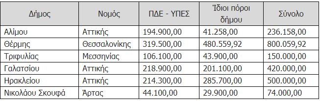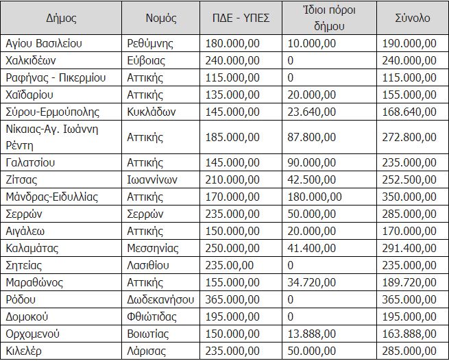 Οι δικαιούχοι δήμοι για τη χρηματοδότηση των ως άνω πράξεων, θα απορροφήσουν πρώτα τους πόρους του Υπουργείου Εσωτερικών. Στη συνέχεια θα χρησιμοποιηθούν οι ίδιοι πόροι των δήμων.