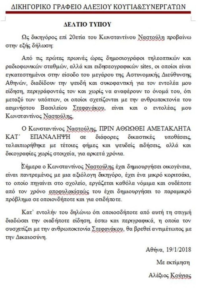 «Σήμερα ο Κωνσταντίνος Ναστούλης έχει δημιουργήσει οικογένεια, είναι παντρεμένος με μια αξιόλογη δικηγόρο, έχει ένα μικρό κοριτσάκι, το οποίο πηγαίνει στο σχολείο, εργάζεται καθόλα νόμιμα και ουδέποτε από τον χρόνο αποφυλακίσεώς του έχει δημιουργήσει το παραμικρό πρόβλημα σε οποιονδήποτε και για οτιδήποτε» συμπληρώνει ο κ. Κούγιας και προειδοποιεί με προσφυγή στη Δικαιοσύνη κατά όσων διαδώσουν είδηση «έστω και περιγραφικά» που θα τον συσχετίζει με την ανθρωποκτονία Στεφανάκου.