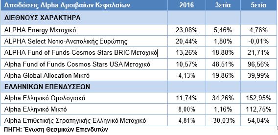 Το 2016, έτος σημαντικών διακυμάνσεων και εξελίξεων σε διεθνές επίπεδο, τα Alpha Αμοιβαία Κεφάλαια (Α/Κ) κατέγραψαν εξαιρετικές αποδόσεις. Μεταξύ των μετοχικών Α/Κ με διεθνή προσανατολισμό, το Alpha Energy (+23,08%) και το Alpha Select Νοτιο-Ανατολικής Ευρώπης (+20,44%) σημείωσαν τις κορυφαίες αποδόσεις του έτους.