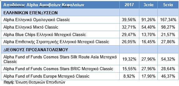 Στην κατηγορία των Α/Κ που επενδύουν στις ελληνικές κεφαλαιαγορές, το Alpha Ελληνικό Ομολογιακό Classic (+39,56%) και το Alpha Ελληνικό Μικτό Classic (+32,71%) σημείωσαν τις υψηλότερες αποδόσεις του έτους μεταξύ των Alpha Α/Κ και παραμένουν στα κορυφαία Α/Κ της κατηγορίας τους κατά την τελευταία τριετία και πενταετία.